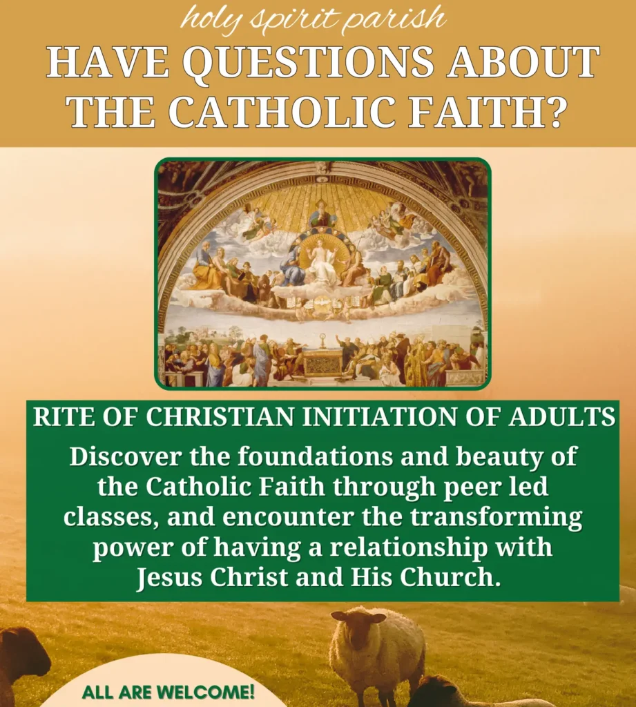Many adults who wish to join the Catholic Church have never been baptized. The church offers unbaptized adults a process of formation in the Catholic Christian faith and way of life called Christian initiation or catechumenate. Christian initiation is a gradual process. It begins somewhat informally with an inquiry period. After the interested person contacts Holy Spirit Parish, he or she will be invited to meet with other people who are exploring the possibility of becoming Catholic. These people have the opportunity to ask questions about the church and to hear about the message of Jesus Christ and how it is lived out in the Catholic Church. A person may continue to participate in these sessions as long as he or she wishes. No commitments are made or expected during this time.